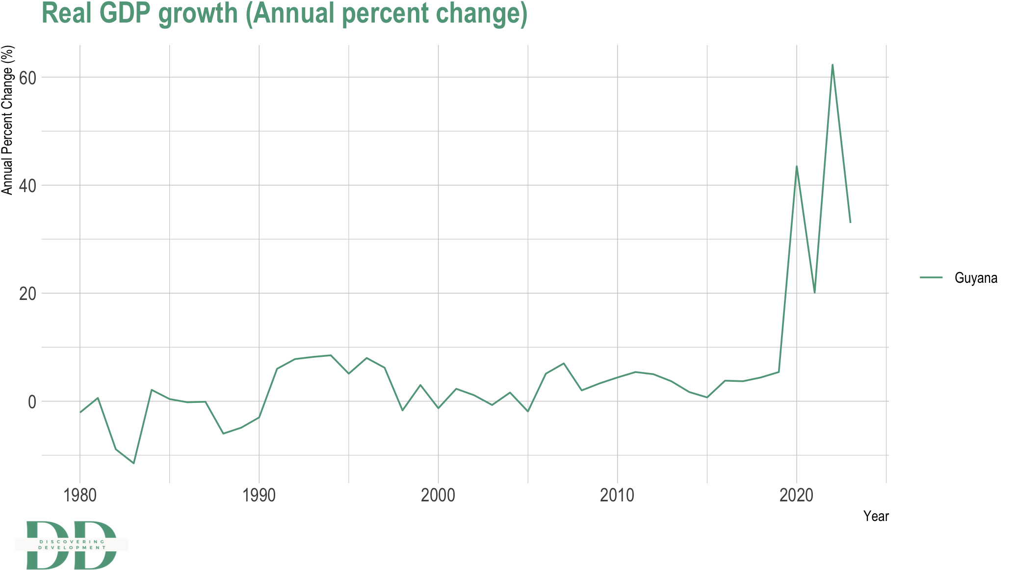 Guyana’s latest GDP growth reflects its upward trajectory. Between 2020 and 2023, it experienced real GDP growth in the double digits [fig.1]. This was an exceptional feat in 2020 when the Covid pandemic caused a global economic downturn. Predictably, Guyana’s speedy climb to petrostate status has inspired discourse regarding the experiences of developing countries with oil riches. Commonly discussed are apprehensions that Guyana could become “like Nigeria or Venezuela” – economies with oil wealth undermined by corruption, and a victim of the resource curse – when a poor country is paradoxically made worse off after finding oil.